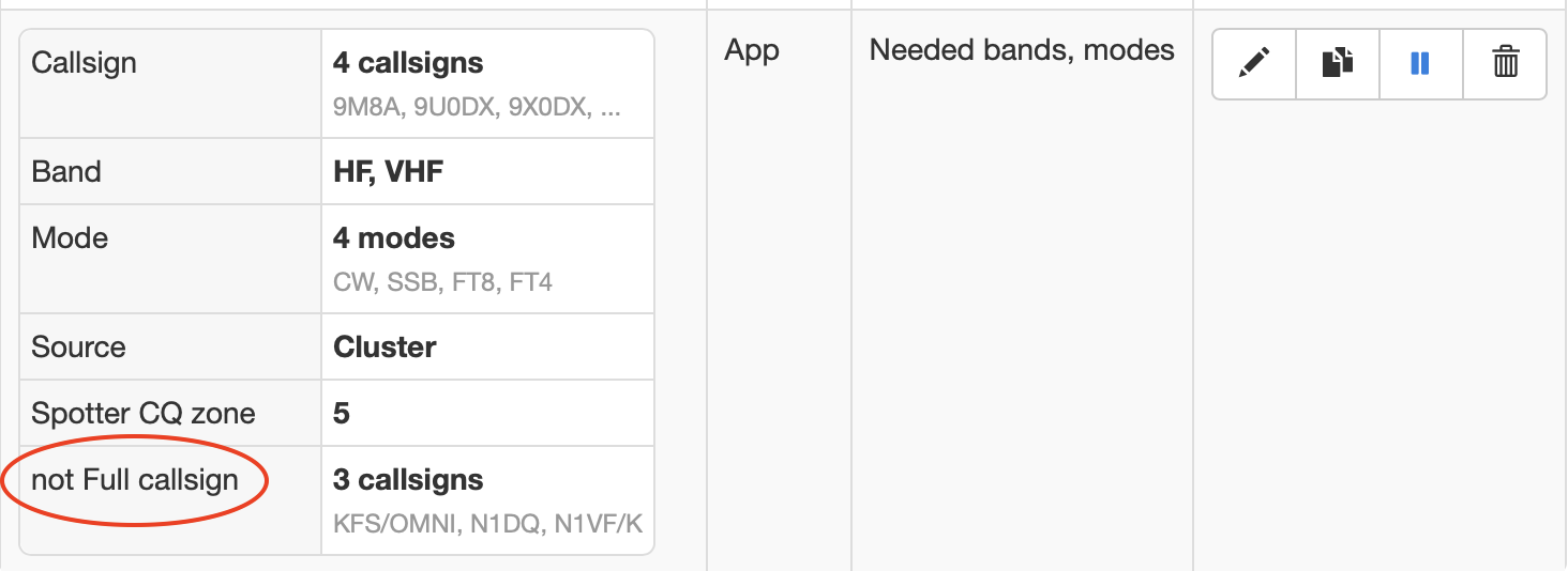 I have 9M8A in for notifications. Almost all of my notifications are from KFS/OMNI (that’s a callsign??) and N1VF/K. I have only Eastern Time Zone for spots. I put both of these callsigns into the ‘Not Spotter Callsign’ and I continue to get spots from both of these ‘calls.’